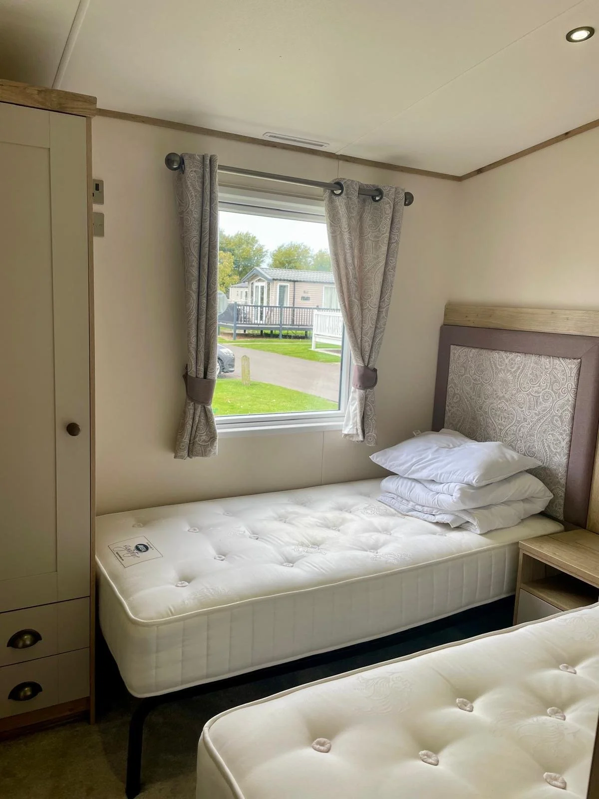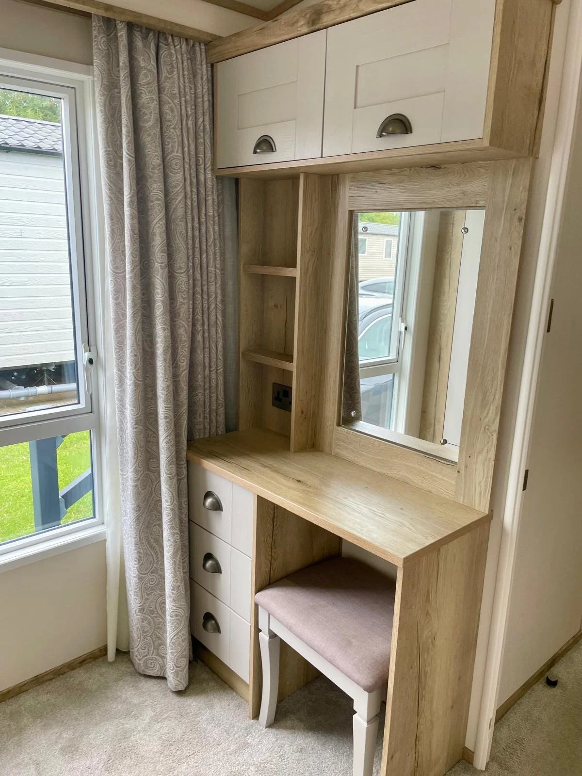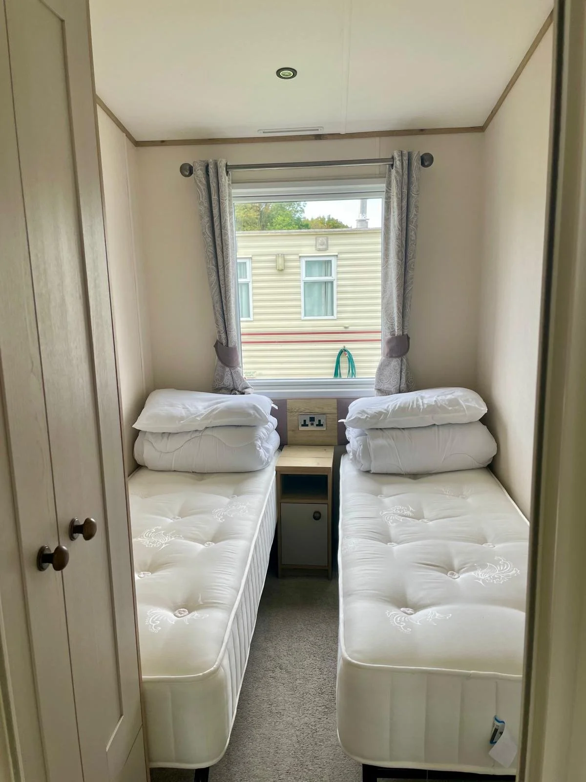 This holiday home sleeps up to 8 people with space designed for both comfort and practicality. The master suite is a peaceful retreat, complete with an en-suite bathroom, generous wardrobe storage, under-bed storage, and a stylish vanity area with stool – perfect for getting ready for a night out or a relaxed evening in. Two additional twin bedrooms each offer full wardrobe storage, ideal for guests or children, while the sofa bed in the living area provides extra sleeping space when needed. Whether it’s family holidays or weekends with friends, there’s room for everyone to rest and recharge.